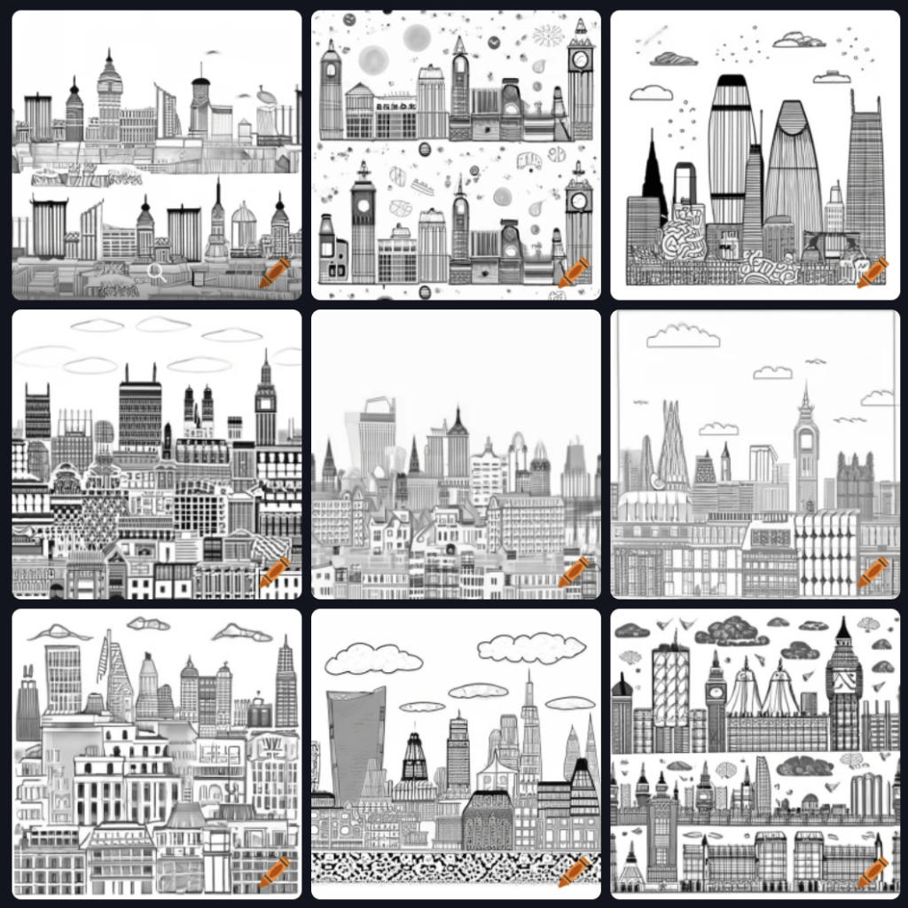 Craiyon gave me nine different options. These seem to be in a more simplistic style and whilst they are vaguely representative of London, some of the cityscapes look more like Copenhagen. Perhaps if I just asked for a general cityscape then these images might have worked better, but apart from Big Ben popping up on a regular basis, these images are not obviously London. Also the clouds are just terrible in all of them!