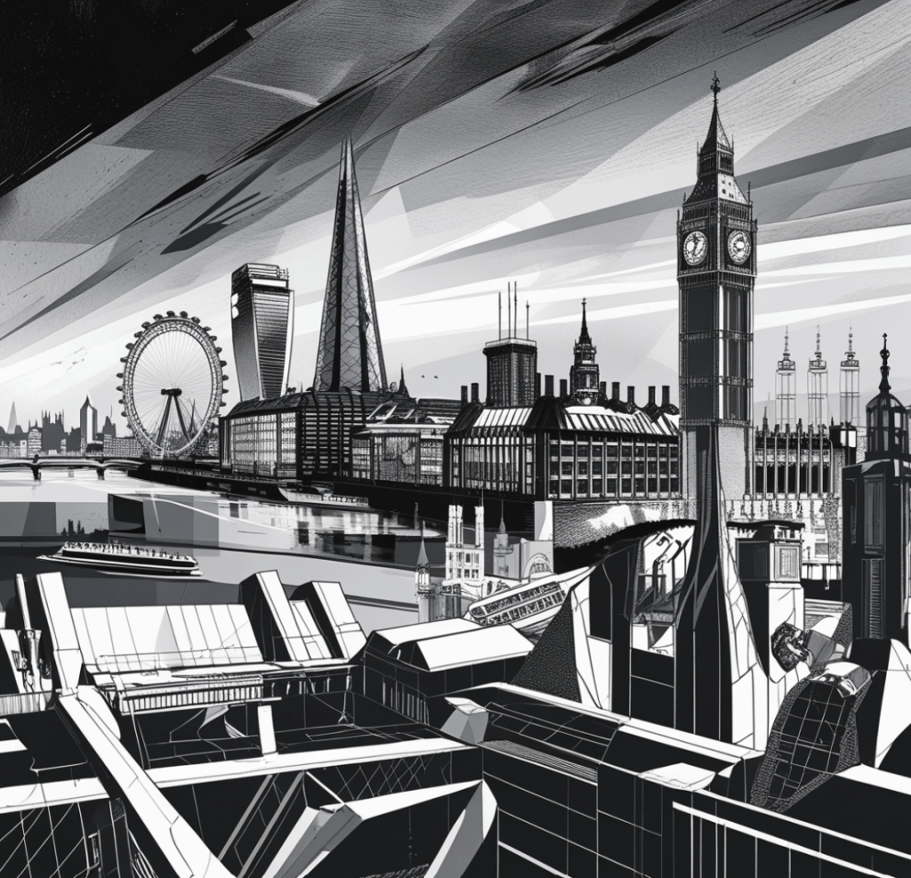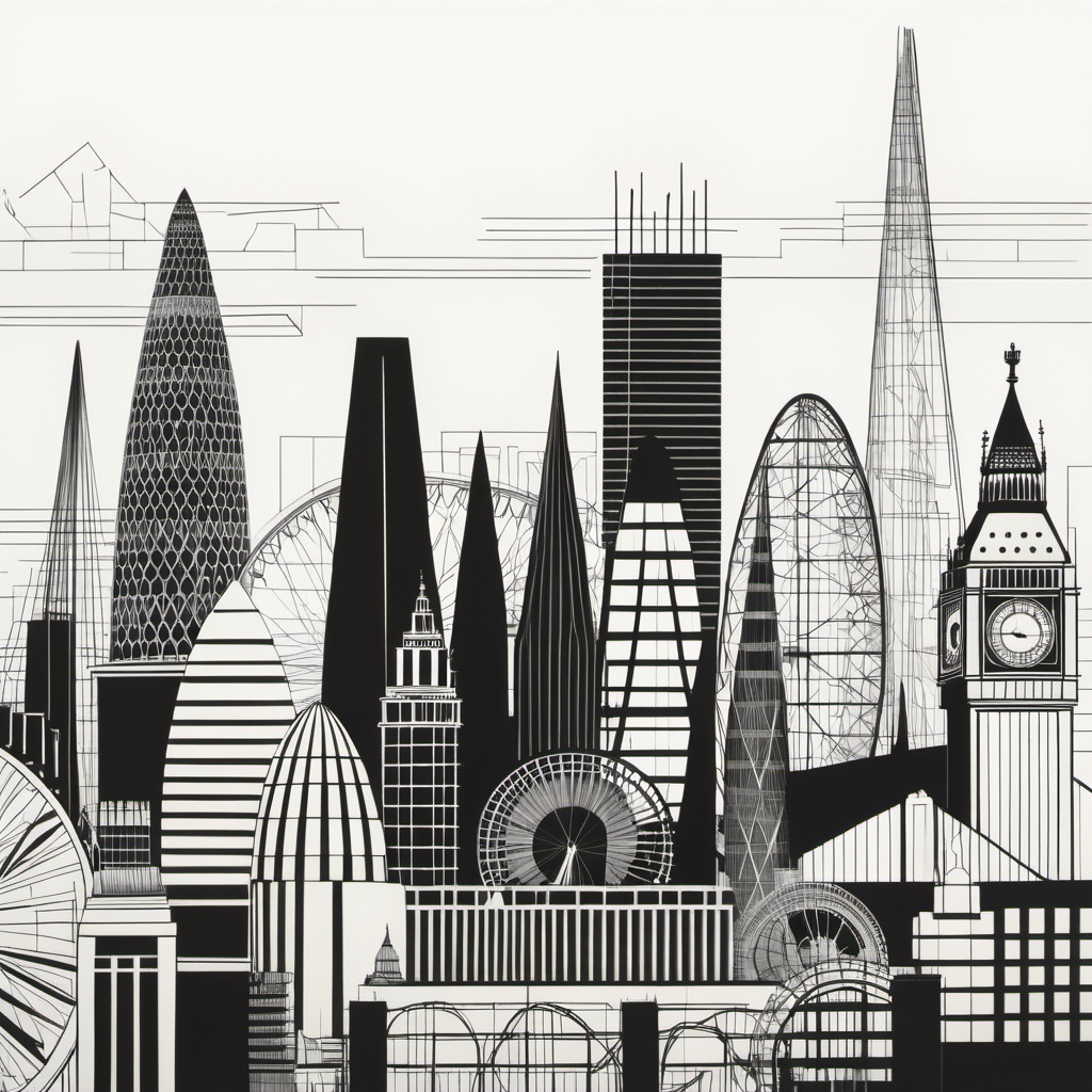 “Black and white drawing of the London skyline in a constructivist style including varied patterns”