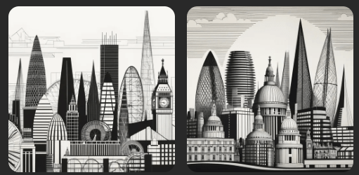 Looking closely at both images, the first one looks like a more representative version of London. The second image has some AI weirdness that doesn’t really work. For example there seem to be multiple domes of St Paul’s cathedral, and there are buildings in the background that I’ve never seen in London, particularly the transparent sail-like building on the right, and the beehive second from left. The first image isn’t perfect either but with some adjustment I think it could work. So this is my choice from Openart.ai: