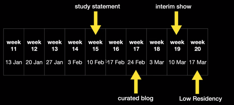 This week was a really good Tuesday session. Well all of them are good of course, but I particularly liked this one because we reviewed details about key dates coming up, the Study Statement due in February, Unit 1 Assessment, and the 1st year MA Interim show. It is likely related to how I think, but I like to know and understand what is coming up and what is expected of me. Truthfully, almost all of the information imparted during the session was already available online, but for some reason it sinks into my brain better when vocalised and discussed rather than just reading the text.