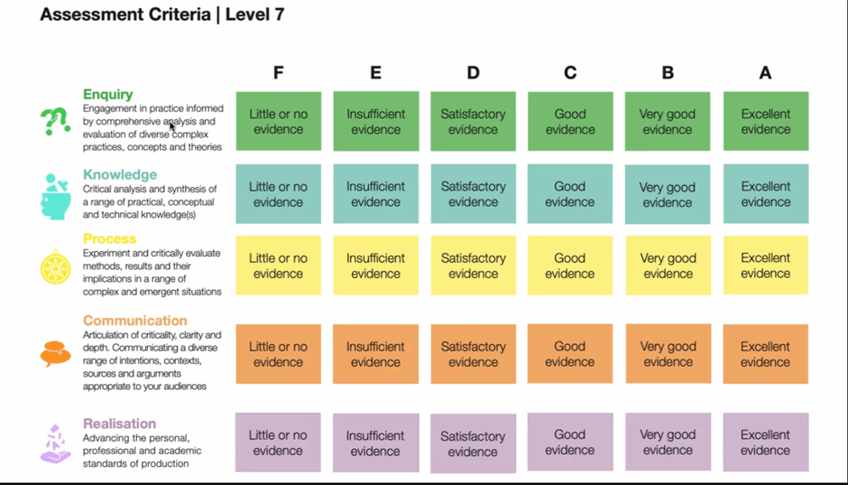 The standard assessment criteria is available online https://www.arts.ac.uk/assessment