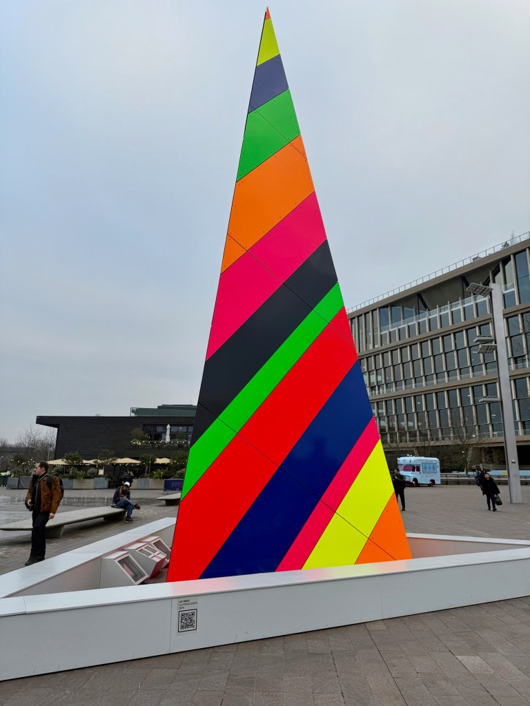 The building is huge and somewhat imposing. There are three water fountain features that come out of the ground at the front. There is also a large colourful sculpture akin to a windsail. I believe that this sculpture space must change regularly as I don’t remember it from last time I was at Coal Drops Yard (but didn’t go into CSM.)