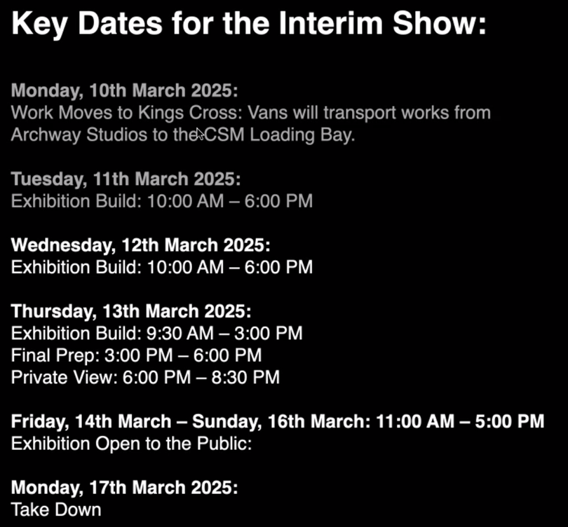 After the break we discussed plans for the interim show in March. Our group will be there along with all of the other First year students across the four MA art courses at CSM. The show runs from Thursday 13 to Sunday 16 March. We will spend all day on Wednesday and most of Thursday setting up.