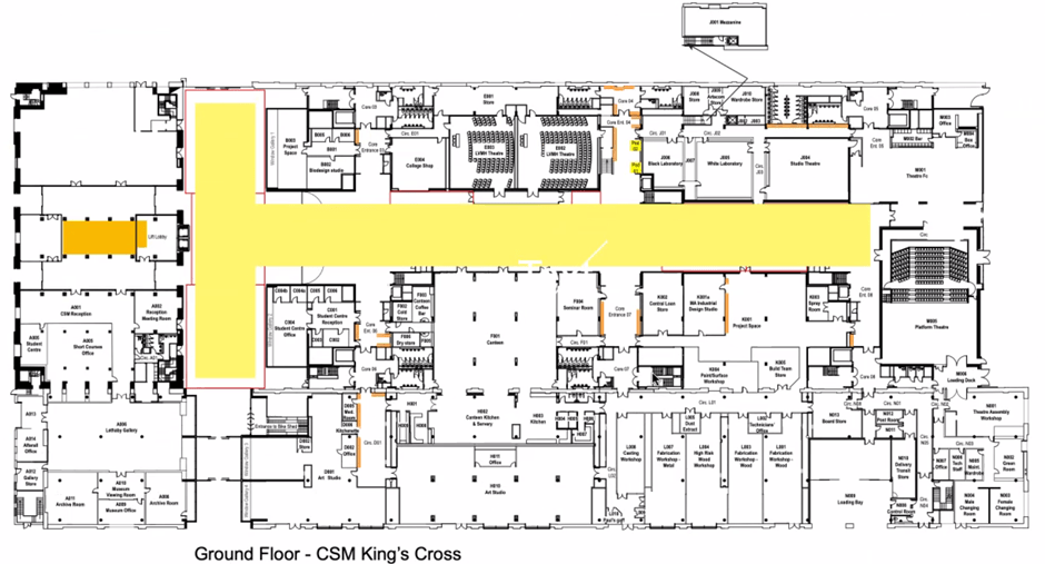 We’re using showing our work in separate space at the front of the building (marked in orange). It has the advantage of being the first space that everyone will see when walking into the building, but the disadvantage of being without usable walls and having low lighting.