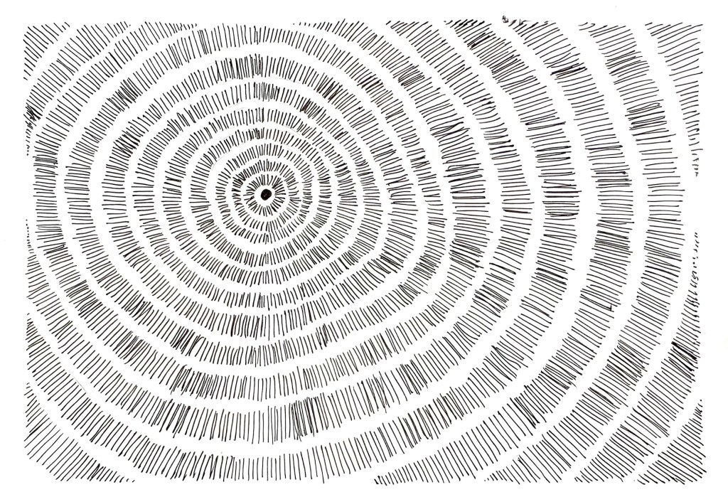 Day 6 is one of my favourite pieces so far. So simple and yet so effective. Using my trusty ruler and ink pen, I selected a centre point and drew randomised straight lines outward from the centre. At first I just had the lines with circles at either end but I felt that it wasn’t enough to make the piece really interesting, so I started drawing the small circles and that really worked well.