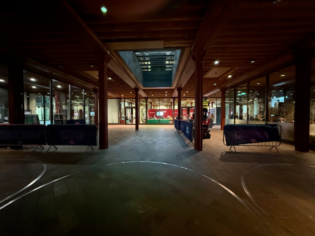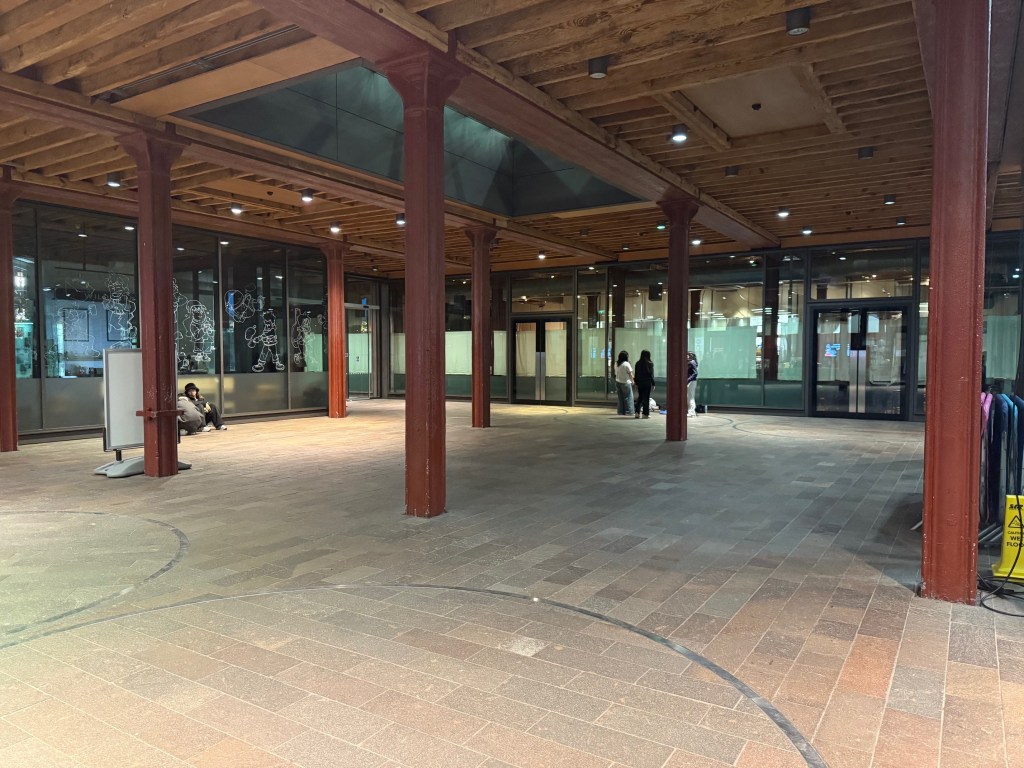 The space we were assigned is the first section you see when coming in the main front entrances. I had visited CSM a few weeks before and took some photos. It is a cool space to be in with interesting beams and wooden details, but I was worried that it would be dark, especially in the evening when the skylight would not be giving light: