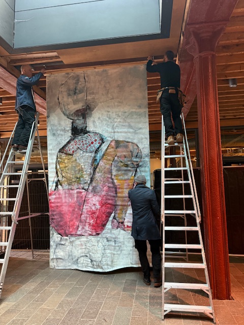 Mateusz’s large painting “Woman on the Beach” was in the process of being hung when I arrived.