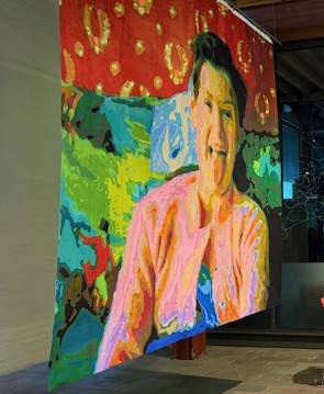 My piece was hung towards the centre of the space, hanging from a metal ceiling post. The technicians helping us to do the hanging were really lovely. Gill helped to hang mine and was patient with me to get it at the right height: