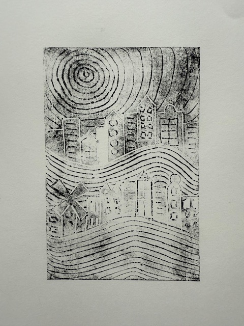 We did a small Lino piece each, which is not something I’ve done in years. There weren’t enough usable tools so I couldn’t make the groves deep enough in my Lino piece.
