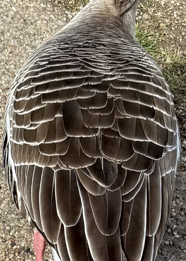 I managed to get a photo of it eventually as it waddled along. I love the layers of feathers and the pattern they make.