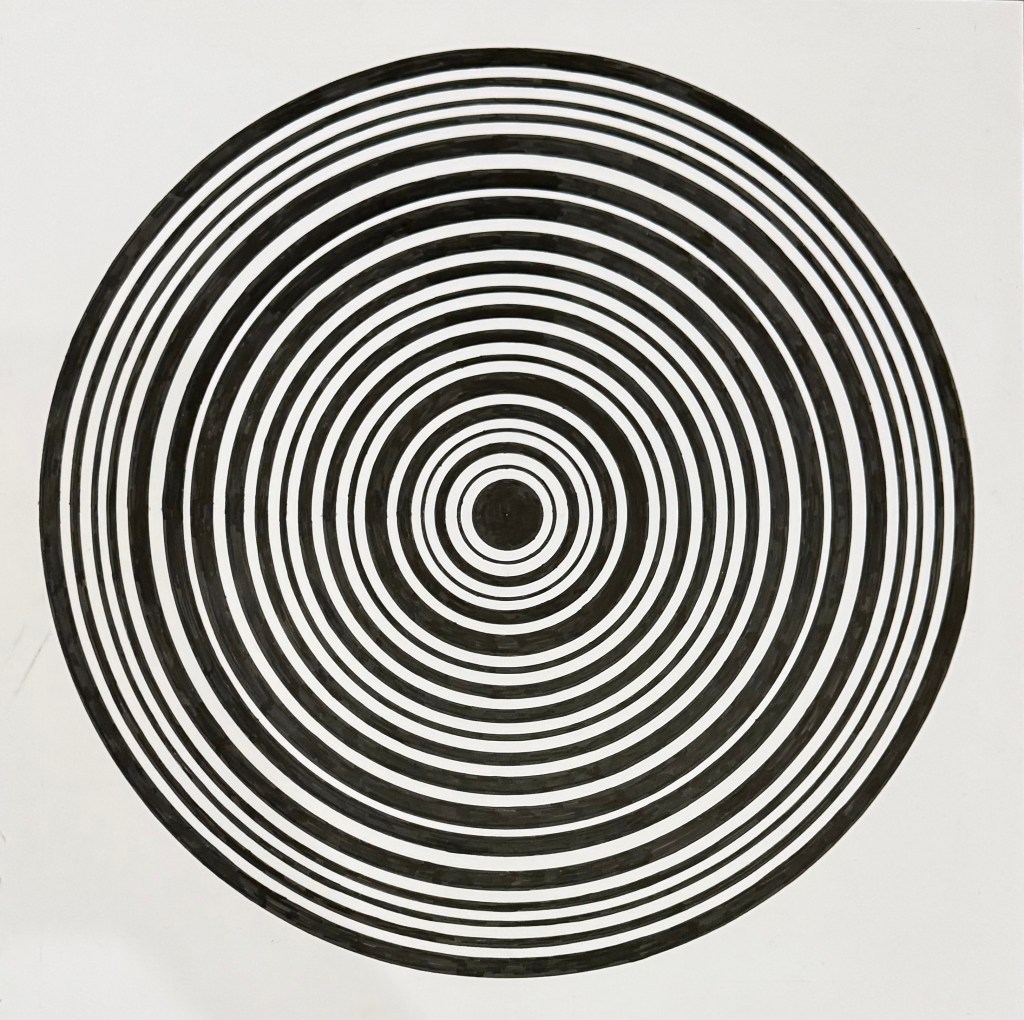 This was done with ink on paper, approximately 40cm x 40cm. It is simple but effective. The more I look at the more the circles seem to move and change.