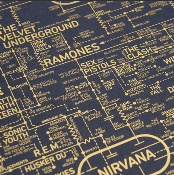 It is a mind map of rock music through the ages and it has an incredible pattern with how it relates each of the bands/artists together. The larger the print, the bigger the band, and it’s amazing to see so many there.