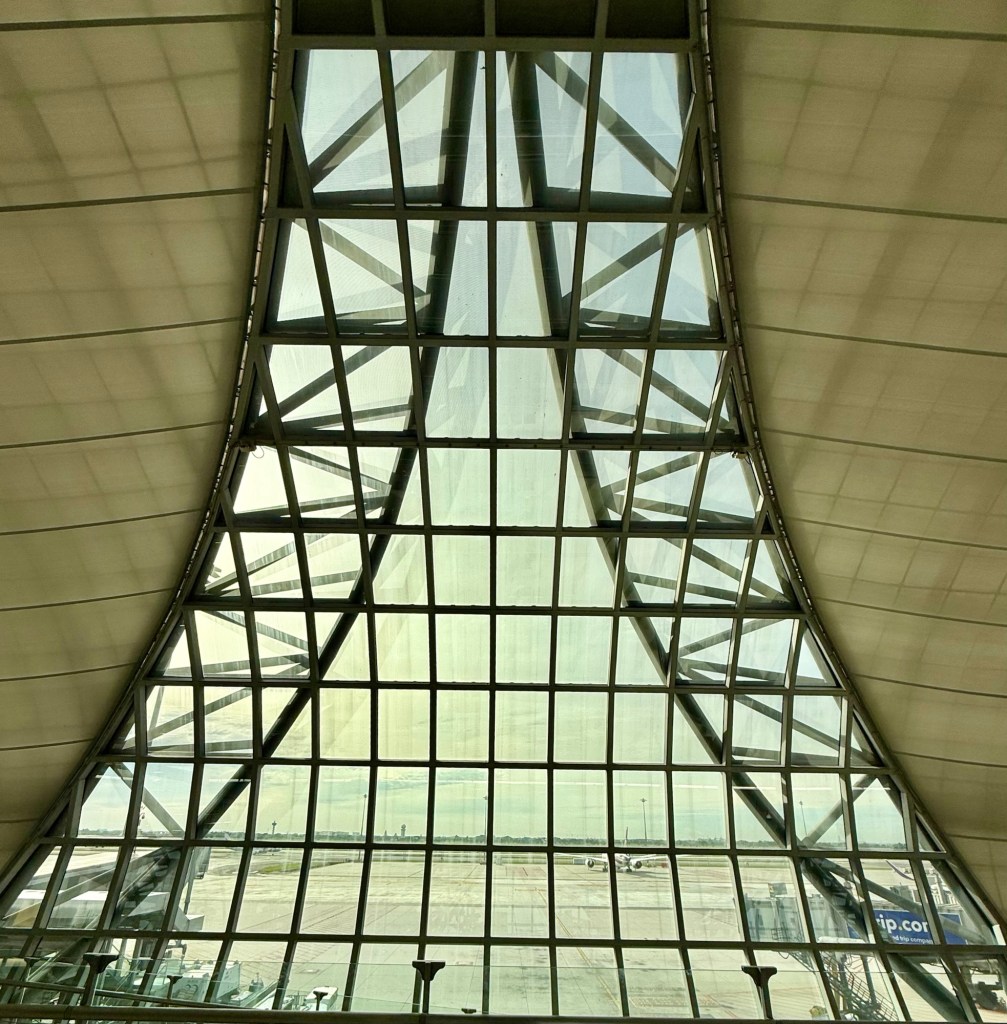 Even the windows are interesting in airports! It’s hard to see the scale of this in this photo but it is at least three stories high. It echoes a sense of flight in the shape and pattern of the windows. Very effective.