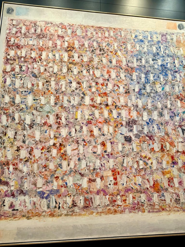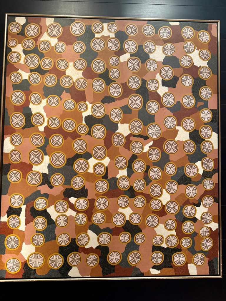 An aboriginal painting in Melbourne. I like the repeating circles with interior concentric rings, with complimentary coloured blocks in the background. It evokes a bit of Kandinsky to me: