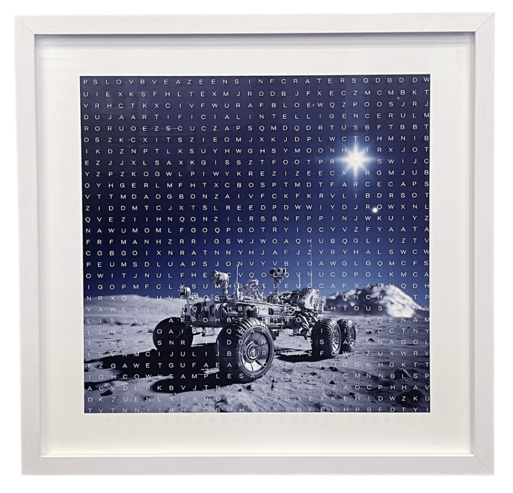 I chatted to the artist, Matt Black, for quite some time about his work and this piece. He created the image himself using a combination of his own photography skills and a bit of AI. He then used an AI word generator to create what is actually a WordSearch (!) with the letters. There are apparently thirty words related to the moon landings hidden amongst the letters.