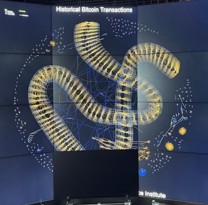 The first one we looked at was a live depiction of bitcoin transactions. It was a moving showcase of bitcoin wallets displayed as dots, with lines showing ingoing and outgoing transactions. It was a constantly moving kaleidoscope of colours and lines that spread across the whole DO.