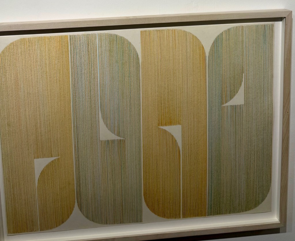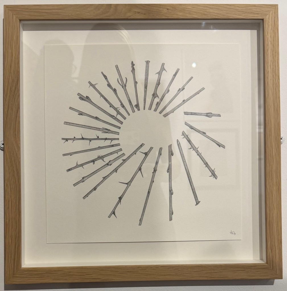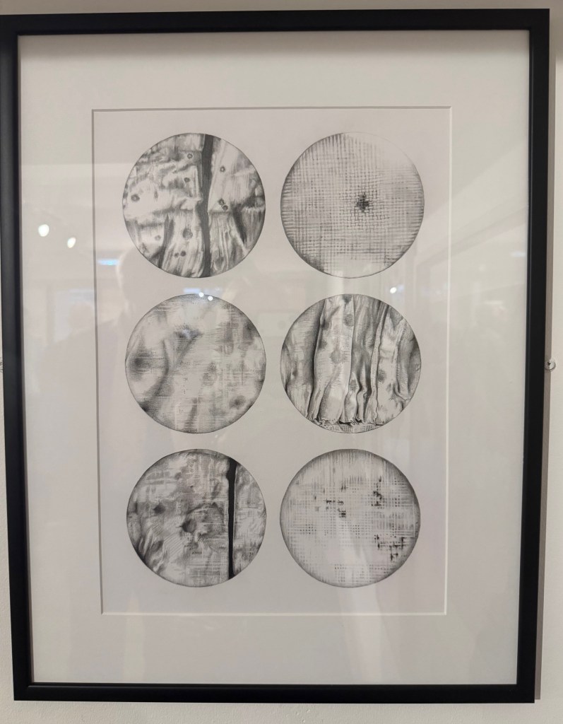 This piece draws me in because it resembles something that I would make myself. The circular form, repeated shapes, and simple monochrome style all echo elements of my own work. Where most of the pieces in the show were dense with multiple techniques, the simplicity of this one captured my attention.