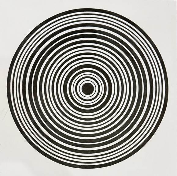 I liked the shapes, lines, and optical effect of the original piece and tried to recreate it in a larger version. Unfortunately I was unhappy with the results of the larger version. I think that I made the lines too fine and too many, with not enough circles on both ends of the lines. Although there is a sense in the larger version of being drawn towards the centre, I can’t help thinking that it is more like a sphincter than a vortex, which is never good for a piece of art.